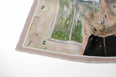 A softly textured painting of a woman standing at a window, looking out onto a gentle landscape of fields and blooms. The scene feels intimate and quiet, framed by hand-painted florals and rendered in loose, expressive strokes that give the scarf a dreamy, contemplative mood.