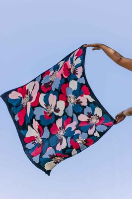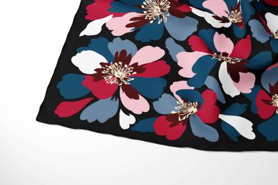 A bold, modern floral pattern featuring large overlapping blossoms arranged in a rhythmic, all-over layout. The sharp contrast between the vibrant petals and the deep black background gives the scarf a striking, contemporary feel with a playful sense of movement.