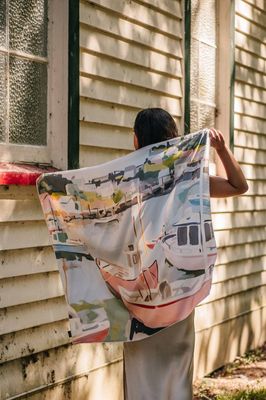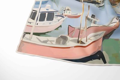 A light, airy coastal scene featuring moored boats drifting in calm harbour water, rendered in soft, blocky brushstrokes. The loose, pastel colouring gives the scarf a fresh, summery feel with an uplifting seaside charm.