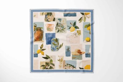 A sunlit Mediterranean collage featuring lemons, ceramics, florals, and seaside vignettes arranged in soft painted blocks. The mix of objects and coastal snippets creates an easy, summery mood with a relaxed, holiday-inspired charm.