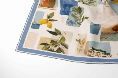 The palette is warm and breezy: soft cream and warm ivory form the base, while accents of sky blue, cornflower blue, and muted sea teal appear throughout the blocks. Lemons bring bright, true yellow with fresh green leaves in olive, sage, and deep leaf green. Terracotta, blush peach, sandy beige, and muted clay tones appear in the pottery and landscape details. The border is a powdery mid-blue with a thin white inner line.