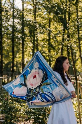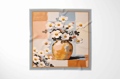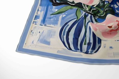 A bold, expressive floral still life featuring oversized peonies in a striped vase set against an abstract blue backdrop. The loose brushstrokes and vibrant contrasts give the scarf a lively, modern-art energy.