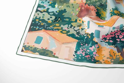 A cheerful Mediterranean village scene filled with sunlit houses, gardens, and rolling hills, painted in soft, blocky strokes. The bright rooftops and lush vegetation create a warm, holiday-inspired atmosphere with plenty of colour and charm.
