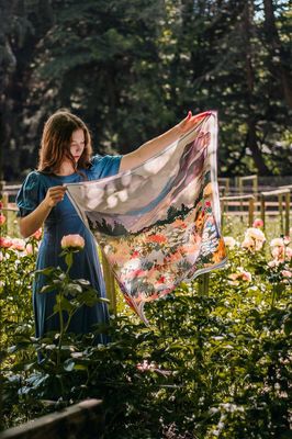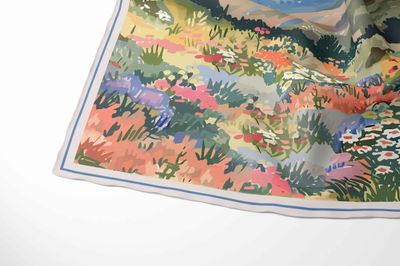 The palette is rich and varied: warm corals, soft peaches, sunny yellows, and creamy whites appear in the flowers, balanced by cool lilac, periwinkle, and soft sky blues. Greens range from deep forest and pine to sage, mint, and olive. The mountains blend slate blue, dusty violet, clay, and taupe. The border is a soft beige with a thin powder-blue inner line.