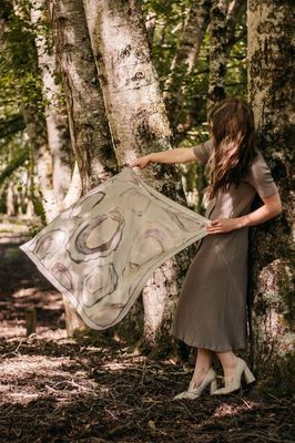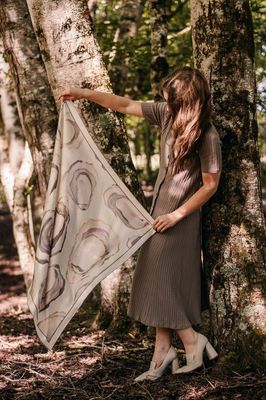 A soft, watercolour-style arrangement of oyster shells scattered across the scarf in an elegant, organic layout. The gentle blending and translucent layers give the design a coastal, airy feel.