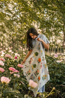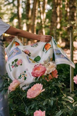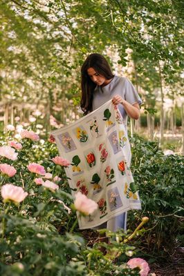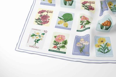 A charming, vintage-inspired grid of floral postage stamps from various countries, arranged in a tidy, repetitive layout. Each stamp features illustrated botanicals—tulips, daisies, primroses, hibiscus-style blooms—and subtle typographic details that give the scarf a curated, collector’s-album feel. The design has a soft, nostalgic elegance, mixing delicate florals with the graphic structure of stamp borders.