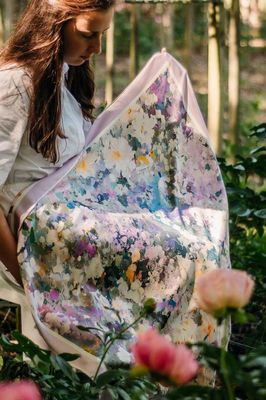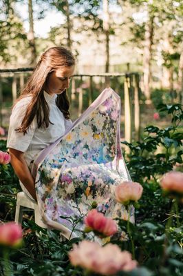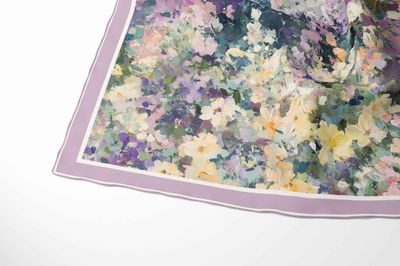 A soft, impressionistic meadow rendered in layered, painterly brushstrokes. The entire scarf surface feels like a blooming field in motion—petals, foliage, and light blending into one another without defined outlines. It has a dreamy, organic flow, with no central motif, giving it that luxurious, all-over fine-art textile feel.
