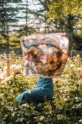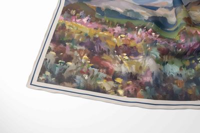 A loose, expressive landscape painting capturing a mountain range washed in soft atmospheric light, with a foreground bursting in wildflowers. Broad brushstrokes and diffused edges give it a painterly, plein-air feel—calm, scenic, and full of gentle movement.
