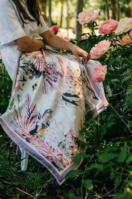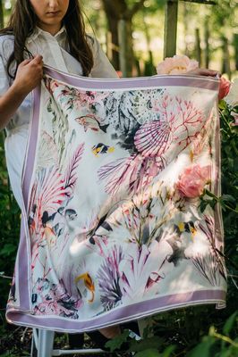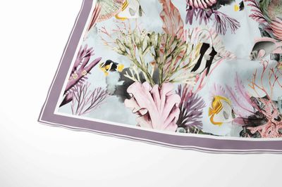 This scarf captures an elegant underwater tableau, filled with flowing coral branches, delicate sea fans, and graceful tropical fish drifting through the scene. The composition layers organic shapes and soft, painterly detailing to evoke the calm movement and dreamy beauty of a coral reef.