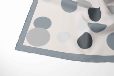 This design is a modern, minimalist study in shape and balance. A soft, neutral ground becomes the canvas for scattered circular forms, each one floating as though suspended in quiet motion. The arrangement is intentionally irregular—playful but still refined—creating a gentle rhythm across the scarf. With its clean geometry and airy spacing, the piece feels contemporary, versatile, and effortlessly polished.