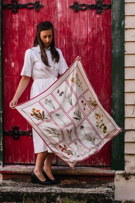 The palette is soft, natural, and garden-inspired, grounded on a warm antique cream background that gives the flowers space to breathe. Botanical illustrations feature greens ranging from sage to fresh stem green, paired with gentle floral tones: butter yellow, tangerine poppy, soft lilac, mulberry, inky purple, and petal pink. These hues feel authentic to traditional botanical drawings—muted yet full of life. A crisp vermilion-red border frames the entire piece, adding a refined, editorial contrast that sharpens the design and elevates its vintage charm.