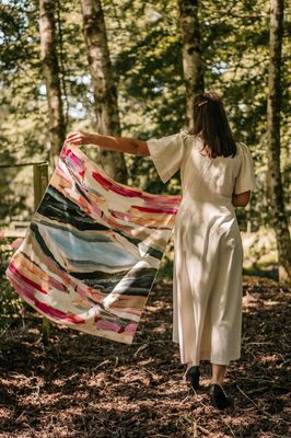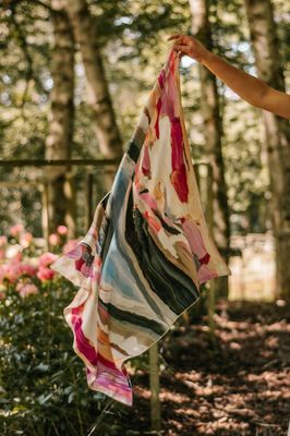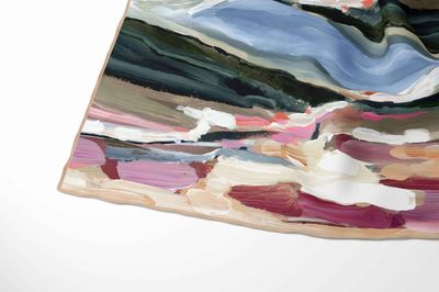 The palette builds a beautiful tension between soft warmth and deep cools. A grounded base of taupe, sand, and warm beige sets a natural foundation, layered with rich accents of berry plum, soft rose, and muted blush pink. Deep, moody greens—ranging from forest to blue-green spruce—add weight and contour through the centre. At the heart of the design, a serene wash of slate sky blue gives the entire piece a calm, reflective anchor. Creamy porcelain whites lift the palette, adding highlights and contrast. The overall colour story feels earthy, artistic, and beautifully balanced.