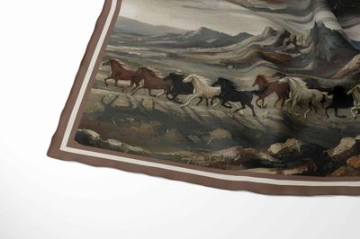 Wild horses move across an open plain beneath a dramatic sky, creating a sense of motion and quiet strength. The composition feels expansive and grounded, capturing the romance of wide horizons and untamed nature.