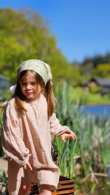 Muted greens sit against a warm oat base, with touches of earthy brown and gentle pattern throughout. The overall effect is soft, wearable, and easy to pair, designed to sit naturally within everyday dressing.