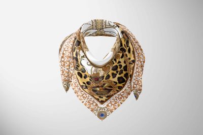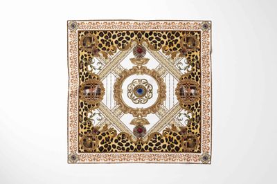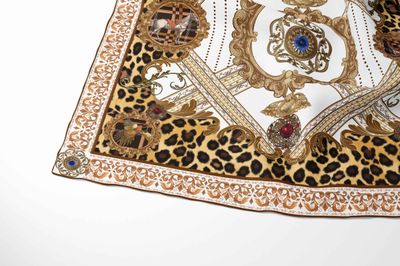 A lavish, maximalist square blending baroque ornamentation with bold leopard print, arranged in a symmetrical, jewellery-like composition. The ornate scrolls, gem motifs, and framed vignettes give the scarf an opulent, statement-making aesthetic with a distinctly vintage-couture feel.