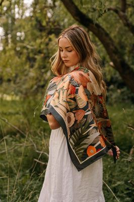 Set on a soft, muted base of warm beige and stone, the palette builds through earthy greens, olive, and moss tones in the foliage. Florals introduce warmth with shades of burnt orange, terracotta, soft rust, and muted coral, balanced by touches of cream and pale blush. Deeper accents of chocolate brown and charcoal add contrast, while the border sits in a dark, inky tone to frame the design.
