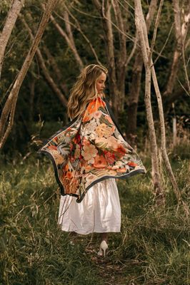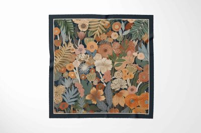 A richly layered floral design with a slightly vintage feel, this piece brings together a dense mix of blooms, foliage, and natural elements in a softly painterly style. The composition feels abundant yet balanced, with movement through the pattern and a darker border grounding the overall look.